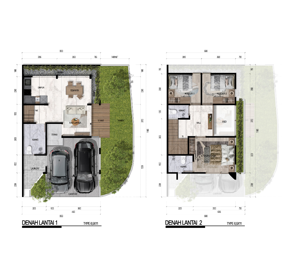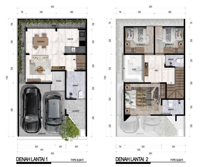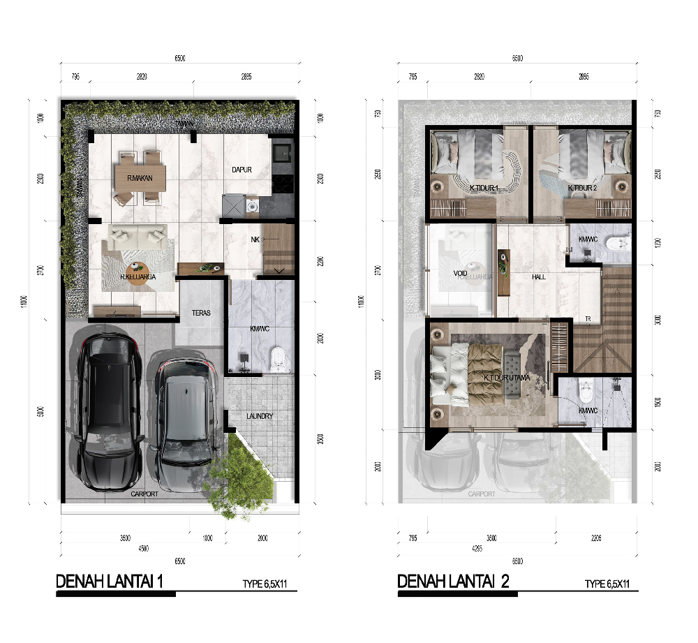 Hunian dengan dimensi lebih panjang dan luas tanah 71,5 m². Dilengkapi 3 kamar tidur, 2 kamar mandi, serta carport 2 mobil. Cocok untuk keluarga yang membutuhkan ruang lebih lega.